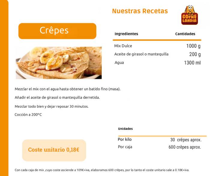 Además de crêpes dulces, este mix funciona como base para múltiples elaboraciones, lo que te permite diversificar tu oferta sin necesidad de comprar varios preparados distintos:
