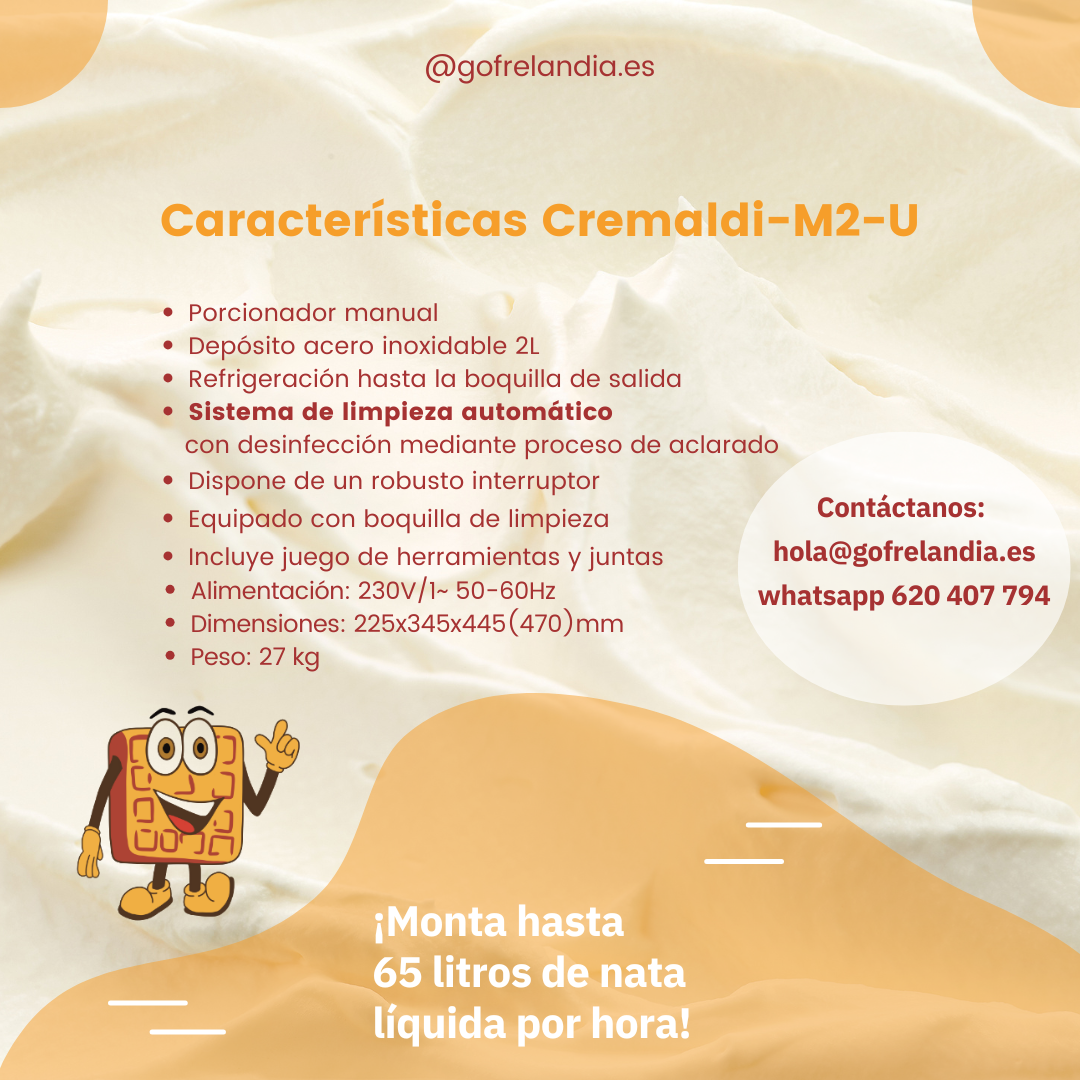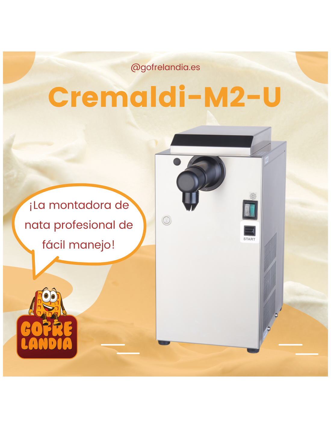 La Montadora de Nata Cremaldi M2 URA está diseñada para obtener una nata aireada, estable y con textura profesional, ideal para heladerías, cafeterías, pastelerías, creperías y negocios de postres. Su sistema de aireación garantiza un resultado homogéneo, voluminoso y visualmente atractivo, perfecto para toppings, copas de helado, gofres, tortitas y postres creativos.