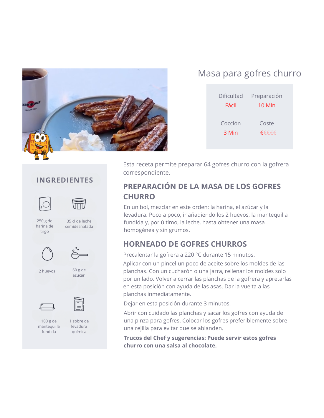 Gracias al molde único de sus planchas, esta gofrera profesional permite realizar gofres churro de manera sencilla y sin freír. Estos gofres de picoteo están especialmente adaptados a la venta ambulante y son ideales para mojar en salsas. Un formato lúdico y práctico que se presta a originales aperitivos y entrantes dulces o salados.
